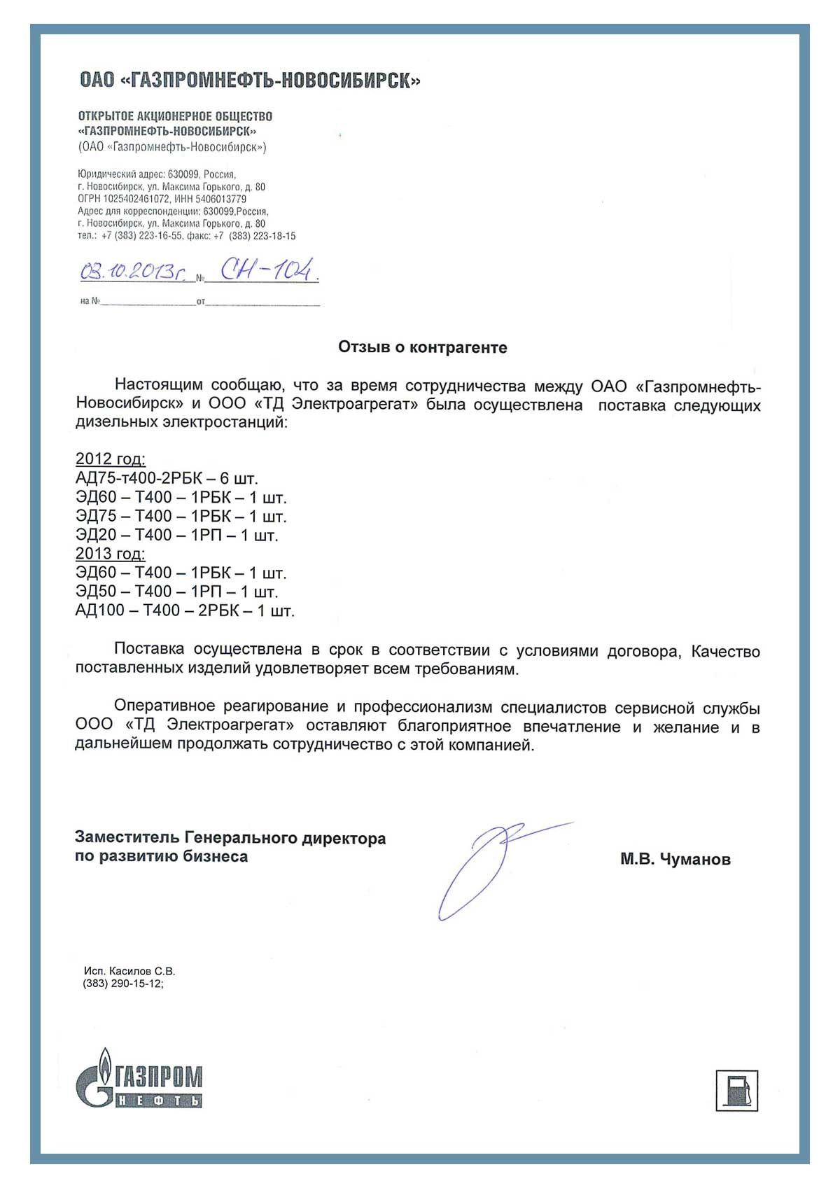 [ALT] => Отзыв контрагентов о компании ООО «ТД Электроагрегат» и исполненном проекте для ОАО «Газпромнефть - Новосибирск»