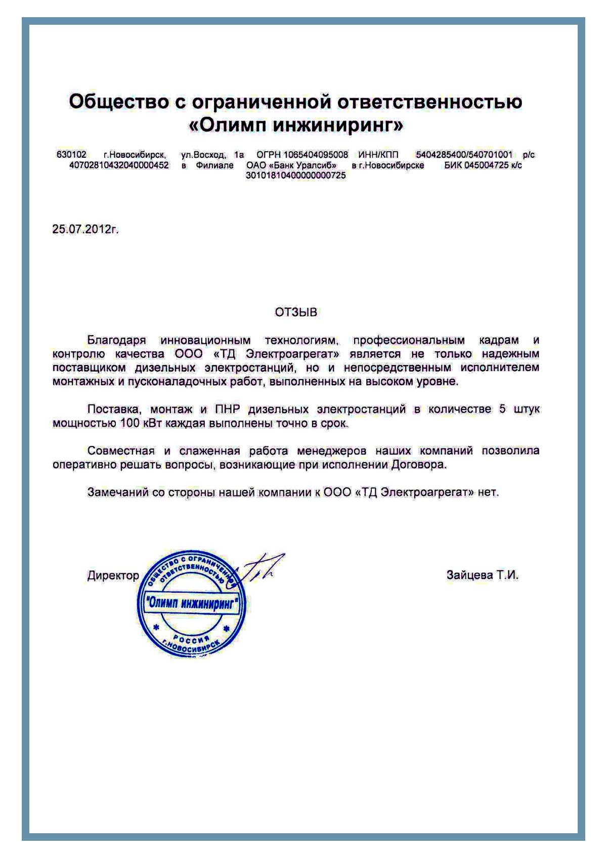 Отзыв контрагентов о компании ООО «ТД Электроагрегат» и  исполненном проекте для ООО "Олимп инжиниринг", г. Новосибирск